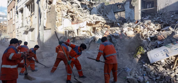 A Red Crescent Society worker steps through the ruins of an auto service centre targeted by US-Israeli strikes in Tehran, Iran. by Sarah Burns in